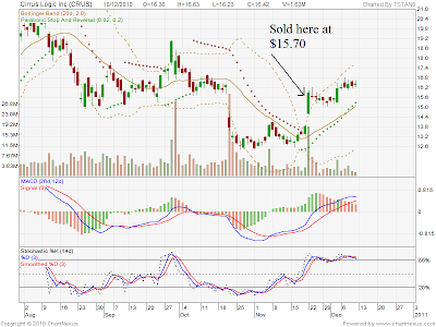 Lesson to be learned: Eventhough, I have make $15K on this transaction, I was not really satisfied cause if I think Crus is a very good share either for long or short term. As long as the demand for Apple products is strong. I believe Crus will continue to outperform in the neart future. I hope that Crus will consolidate within these few weeks cause I would like to enter again, however, once entered, I will stick for a long term which is at least 3 months down the road.